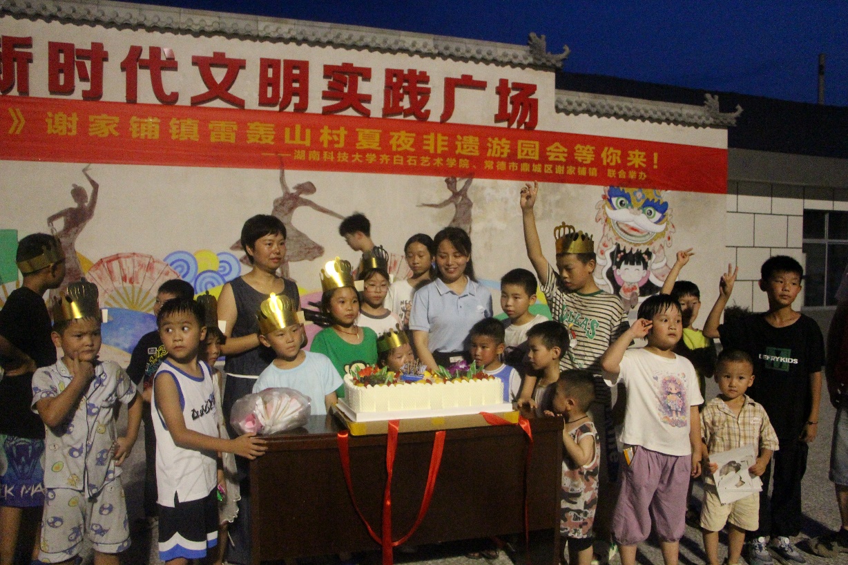 入夜后的雷轰山村小广场化身文化展示大舞台,一场“和美乡村夏夜非遗游园会”在村民们一段激情欢快的广场舞中拉开序幕,村民们一边喝着清爽消暑的饮料,一边欣赏着大学生实践团集体热情洋溢的唱跳表演。活动现场,大学生实践团精心策划为当月过生日的留守儿童举办了一场温馨的生日派对,在大手拉小手的欢快舞蹈中,和小小寿星们一起唱生日祝福歌,分享甜蜜的大蛋糕。在非遗游园漆扇体验区,吸引着众多村民手感受传统工艺的精妙与匠心独运,一把把精致细腻的漆扇在灯光下闪耀着东方雅韵;制作台前,在实践团成员的细致指导一个个生动的角色在孩子们的手中舞动,古老的艺术在他们手中焕发新生;手绘糖画,一丝丝入口的香甜,唤起了儿时的记忆;石膏彩绘,用创意描绘美好时光。每一份作品都承载着村民们的创意与梦想,让这个夏夜充满了甜蜜与温馨。本次非遗游园会不仅是一场文化秀,更是一次人与人心灵的交流与情感的凝聚。