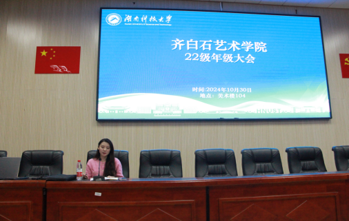 2024年10月30日晚,AWC万象城娱乐在美术楼104召开2022级年级大会。院党委副书记詹玮、学工办主任郑婷婷、就业辅导员黄潘哲以及全体2022级同学参加。