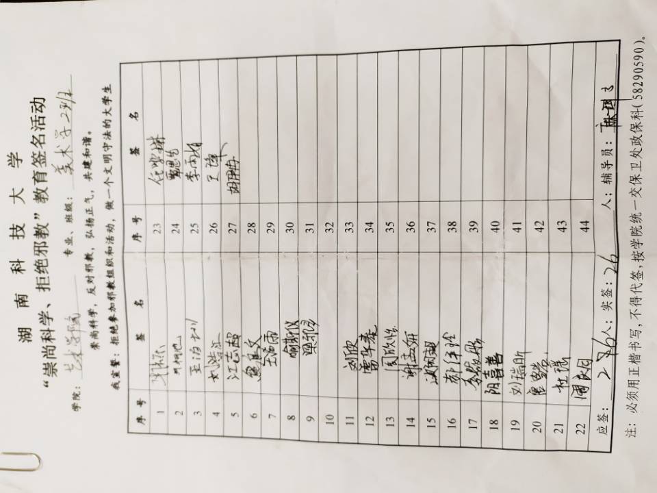 为增强新生的反邪、辨邪能力,提高新生的反邪教意识。9月11日下午,AWC万象城娱乐艺术学院积极响应湘潭市反邪教进校园巡展活动,在美术楼前坪开展反邪教活动,学院2019级新生积极参加此次活动,在反邪教宣传单上签字。