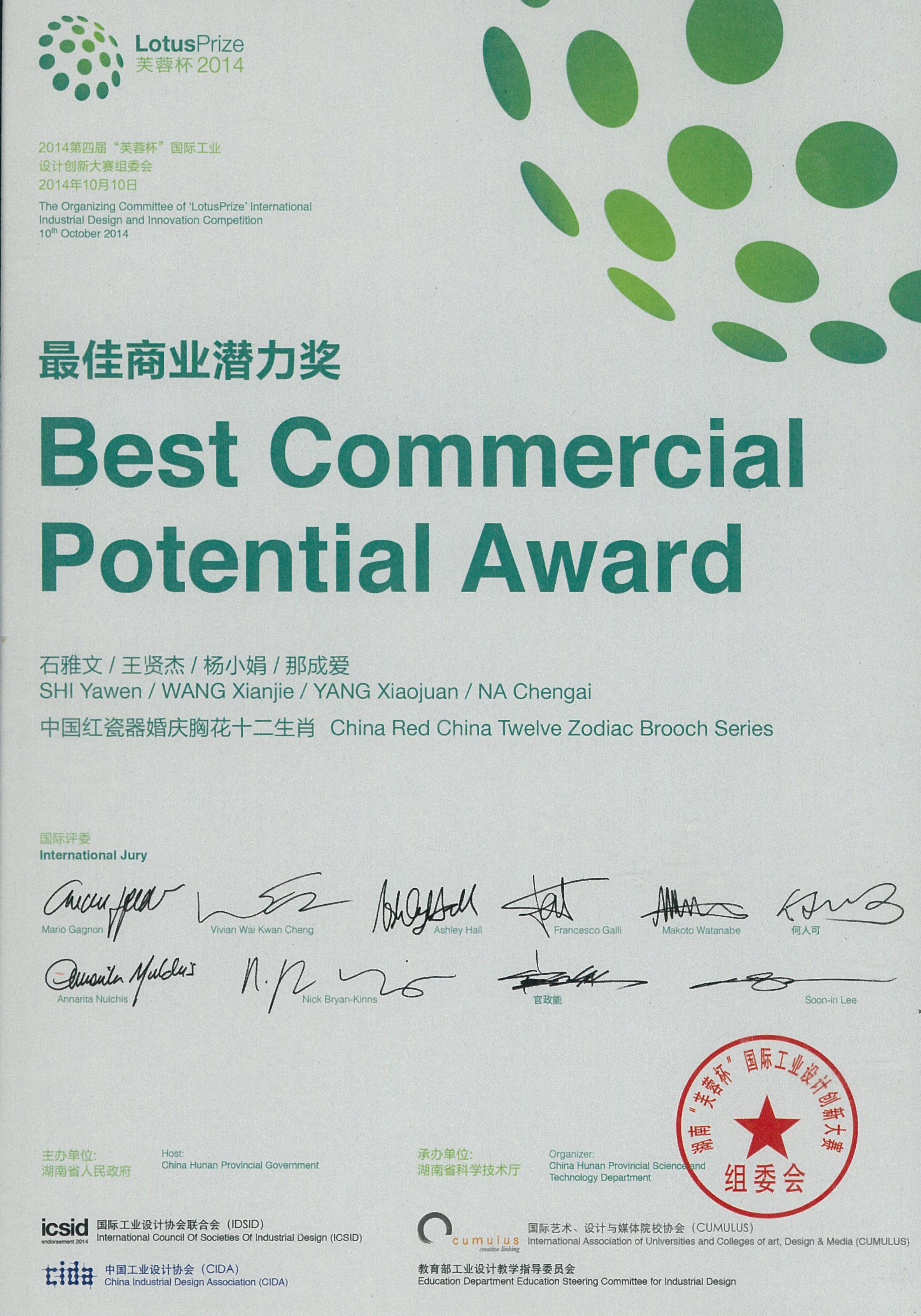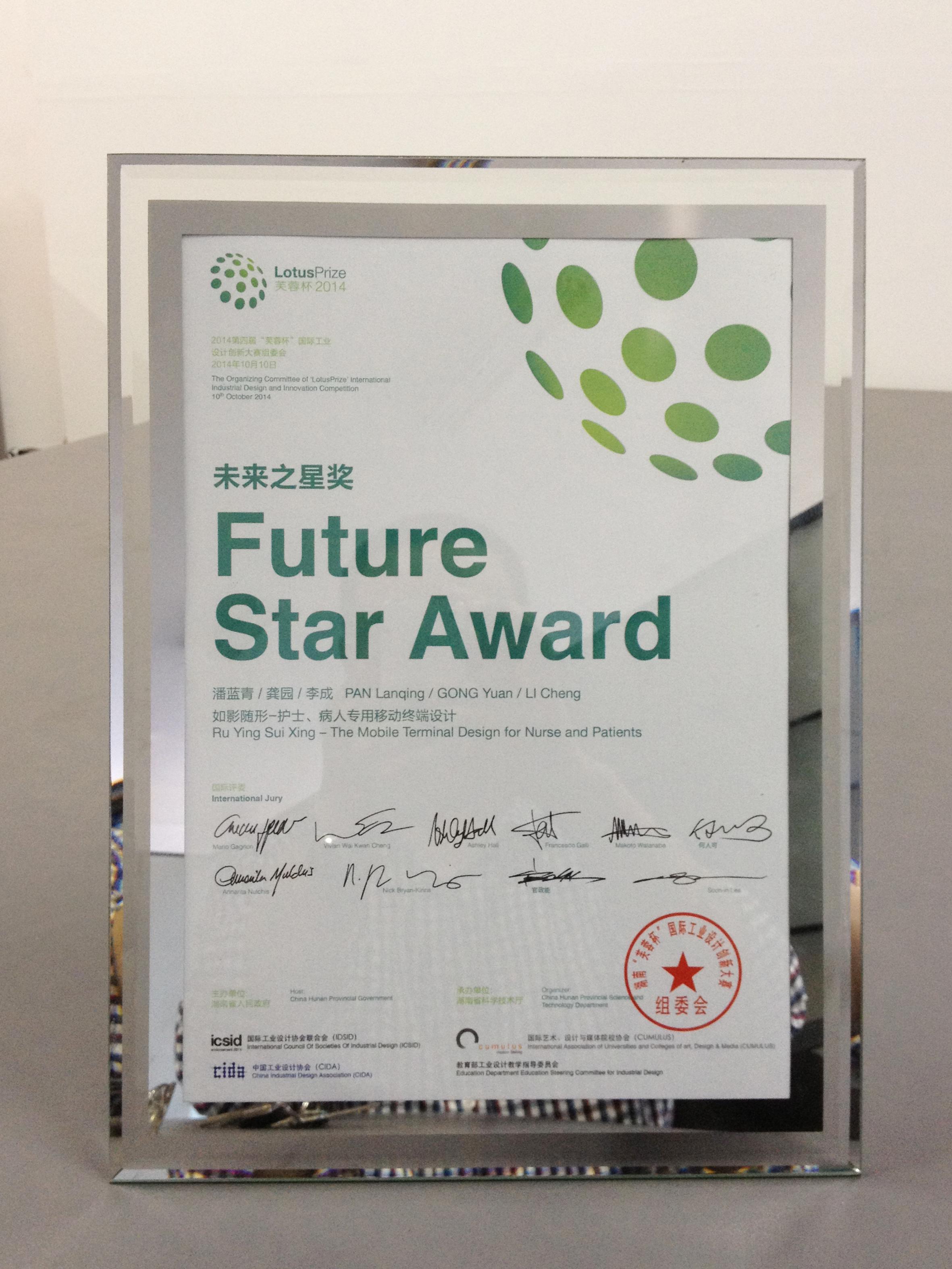 获得24强终评的3件作品分别是:《智能联控烟灶产品创新设计》与《中国红瓷器婚庆胸花十二生肖》获“最佳商业潜力奖” ;《如影随形—护士、病人专用移动终端设计》获“未来之星奖 ”。