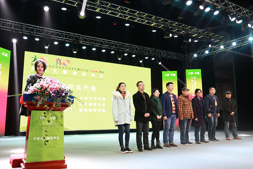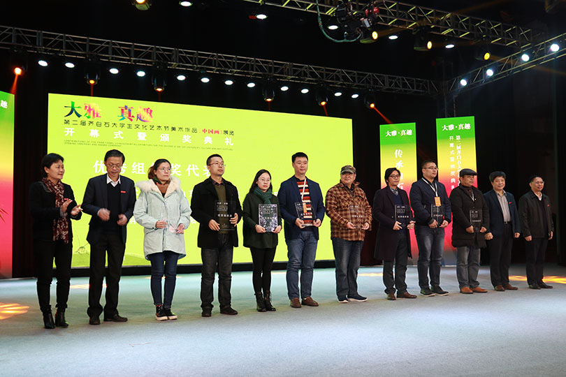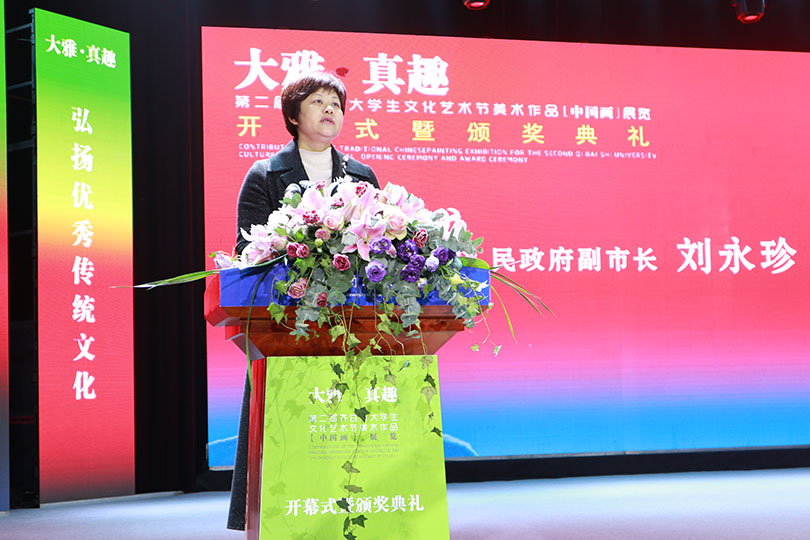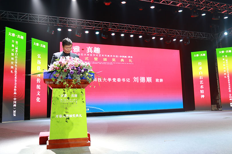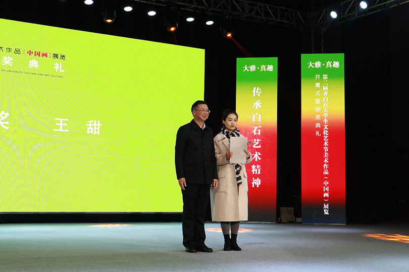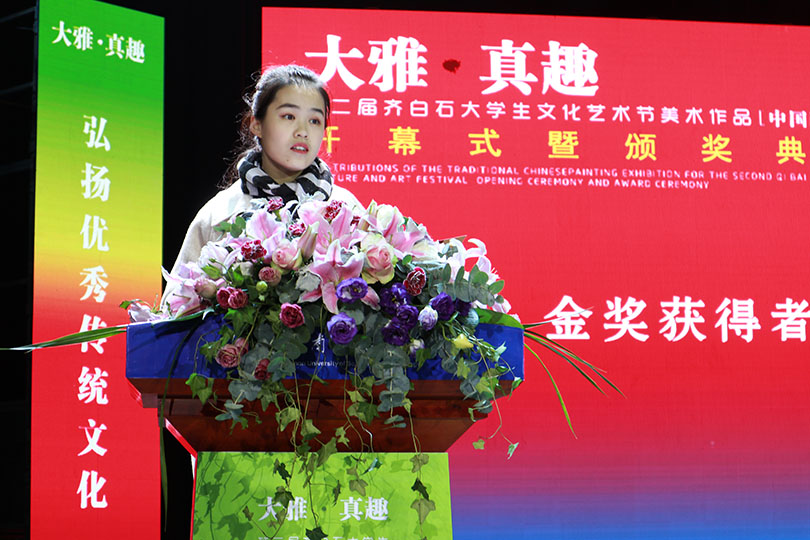 开幕式上,我校党委书记刘德顺致欢迎辞。他代表我校向艺术节的开幕表示热烈祝贺,向莅临开幕式暨颁奖典礼的各位领导、来宾表示诚挚欢迎,向关心和支持学校发展和文化传播的社会各界人士表示由衷感谢,向各位获奖者表示由衷祝贺。湘潭市人民政府副市长刘永珍对艺术节给予了高度评价,她说,我校以“齐白石”冠名的艺术节很好地激发了青年艺术学子对艺术的追求与热情,展现了当代大学生的精神风貌。紧接着,到场嘉宾为获奖个人和单位颁发金、银、铜、优秀作品奖与优秀组织奖。金奖获得者,来自东北师范大学美术学院王甜发表获奖感言。她表示非常感谢此次艺术节给自己提供了学习交流和展示的平台,并希望更多的青年学子在艺术的道路上推陈出新,不忘传统;初心不改,砥砺前行。