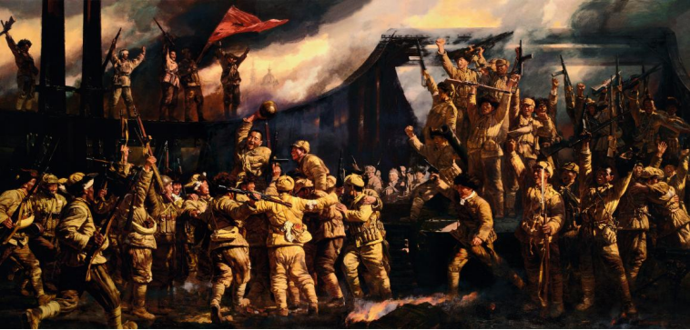 此外,画家们还巧妙地运用了象征性元素,如飘扬的红旗、挺拔的松柏等,这些元素不仅丰富了画面的内容,也增强了画面的主题性和历史感。它们象征着革命的胜利、人民的解放和国家的未来,使得这幅油画在具有艺术美感的同时,也蕴含着深刻的思想内涵。