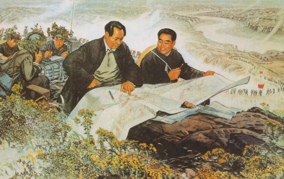 《历尽艰辛为人民——毛主席和周总理在转战陕北途中》这幅作品,是刘文西与陈光健两位艺术家共同创作的杰作,它不仅展现了革命领袖在艰苦环境中的坚定意志,还深刻传达了中国共产党人为人民解放事业不懈奋斗的伟大精神。 下面,将从构图、色彩、绘画语言、细节描绘、方面进行详细赏析。该画采用了深远而富有层次的构图方式,将观者的视线自然引导至画面的中心——毛主席和周总理。 两位领袖坐在简陋的木板凳上,聚精会神地查看作战地图,这一场景被巧妙地置于画面前景,成为视觉焦点。背景中,战士们或抄写电报,或发电报,忙碌而有序,展现了革命队伍的紧密协作。远处的山峦叠嶂,旗帜招展,行进中的队伍隐约可见,不仅拓展了画面的空间感,也预示着革命事业的广阔前景。 整个构图既紧凑又富有张力,让人感受到革命战争年代的紧迫与希望并存。色彩运用上,这幅作品采用了质朴而沉稳的色调,与转战陕北的艰苦环境相契合。画面以暖色调为主,如土黄色、棕色等,这些色彩不仅增强了画面的历史厚重感,也寓意着革命者坚韧不拔的精神品质。 在毛泽东和周恩来身上,光影处理得当,使得他们的形象更加鲜明突出,展现了领袖的睿智与威严。同时,远处山峦的淡蓝色与近景的暖色调形成对比,增强了画面的空间感和层次感。刘文西与陈光健两位艺术家以精湛的技艺和深厚的情感,创造了这幅充满力量的作品。 他们采用了中国传统工笔画的细腻与西方油画的立体感相结合的方式,使得人物形象生动逼真,场景描绘细致入微。在毛泽东和周恩来查看地形图的细节上,画家们尤为用心。两位领袖的表情专注而深邃,手指轻轻划过地图上的山川河流,仿佛在运筹帷幄之中决胜千里之外。 他们的眼神交流,更是无声地传递着坚定的信念和深厚的战友情谊。在细节描绘上,这幅作品同样堪称典范。从领袖身上的衣物褶皱到战士们手中的电报纸笔,从地图上的标注到远处的旗帜飘扬,每一处细节都经过精心雕琢。 特别是毛主席和周总理的服饰和神态,更是体现了艺术家们对历史的尊重和对人物的深刻理解。此外,背景中战士们的活动也生动展现了革命队伍的纪律严明和高效运作,为整个画面增添了更多的生活气息和时代感。