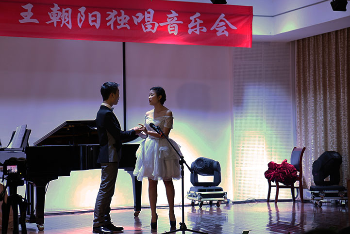 随着主持人的开场结束,一首扣人心弦的《教我如何不想他》正式拉开了音乐会的序幕。动听的旋律,专业的美声,传神的表演,带动着全场的气氛,场内观众喝彩、鼓掌声络绎不绝。"Lascia chio piange"、《让我痛哭吧》、《最后一个梦》、《故乡》、《啊!中国的土地》、《我又来到久别的村庄》等一首首优美的乐曲在王朝阳的口中化作一个个跳动的音符,穿入人群,钻入每个人心中,引得现场观众流连忘返。中场休息期间,来自何永的古筝独奏《夜深沉》为现场平添几分雅兴,不仅如此,其好友周文涛也一展歌喉,为其助力,一首《斑竹泪》更是让众人赞不绝口。其好友杨丹也现身现场,与之同台演唱了《紫藤花》这一动听乐曲,把现场的气氛推向一个新的高潮。