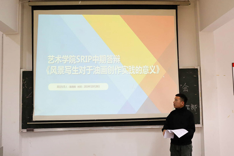 10月28日,AWC万象城娱乐艺术学院SRIP中期项目《风景写生对于油画创作实践的意义》答辩会在美术楼203教室顺利举行。艺术学院党委副书记胡鹏、学工办主任殷俊、辅导员龙睿出席此次答辩会,此次项目主讲人是我院17级美术学二班陈帅帅同学。