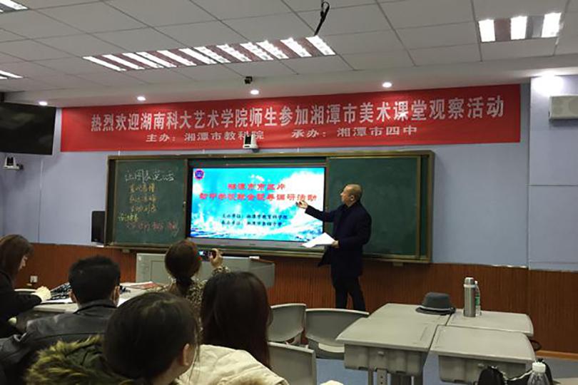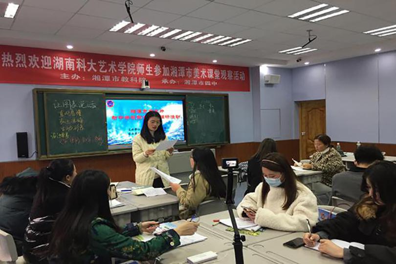 为加强我院美术教师教育与地方教育行政部门和地方中小学的联系与合作,促进我院美术师范教育专业化发展,同时为美术学专业学生提供教育教研的实践机会和平台,12月8日上午,由湘潭市教育科学院主办,湘潭市第四中学承办的美术教育课堂观察活动暨湘潭市市直片初中学校美术学科联合调研活动在湘潭市第四中学顺利举行。此次活动由湘潭市教科院美术教研员邓宏组织,湘潭市市直、园区、雨湖区老师代表,艺术学院带队老师王亚楠、研究生代表、17级美术学专业的学生代表以及19级美术学专业的全体学生参与了此次活动。