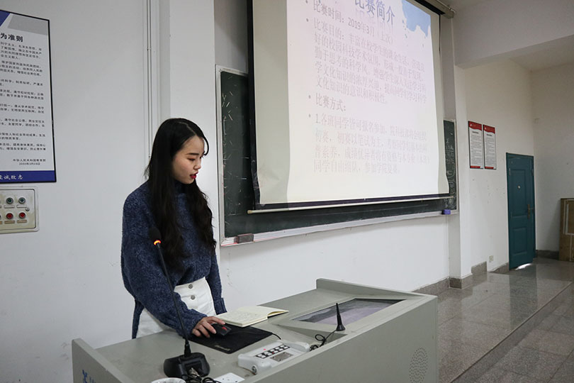 会上,主持人首先为大家详细介绍了本次宣讲会的流程。之后,叶阳天同学对节能减排大赛及其举办意义和重要性作了介绍,并为同学们指引了参加节能减排大赛的方向。接着,何可奕同学用简练的语言与大家分享了参加科普知识竞赛的经验和心得体会,以此鼓励同学们积极参加科技赛事,去探索科技的奥秘。随后,王屹同学结合PPT详细地向大家介绍了srip项目相关知识,他希望同学们积极组建自己的团队、确定自己团队的参赛项目,及时上交项目申报书。最后,我院学生会主席陈帅帅为本次大会作总结,他表达了对本次活动的看法和对同学们的期待,希望同学们通过本次宣讲会能有所收获,积极参与各类比赛,去创造属于自己的精彩的大学生活。