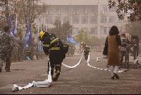 烟雾起,警报响,消防演练正式开始,消防车立刻赶来,消防员行有条不紊地进行着灭火工作。在疏散过程中,参加演练的同学们谨遵教官的教导,在消防员的指引下,用湿毛巾捂住自己的口鼻,弯下腰迅速地按着规划路线向外疏散撤离。