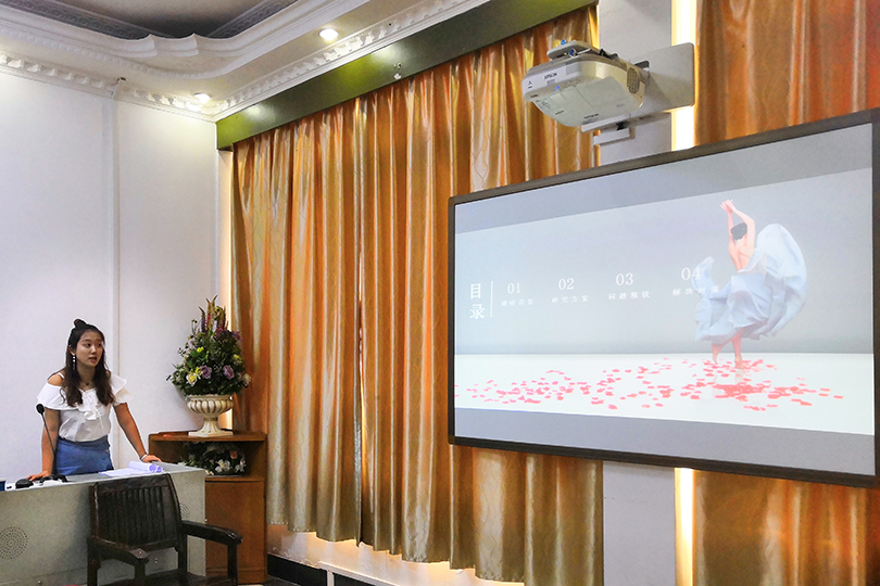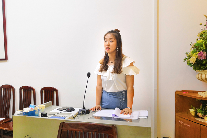 答辩会上,朱莉莎首先结合PPT内容,向大家介绍了项目的基本概况以及自己的感悟,朱莉莎从多个方面分析了“渗透式”软开度训练在少儿拉丁舞中的实用性,项目极具创意又兼具实践性,新颖的观点、独到的解说给与会人员留下了深刻的印象。在认真听取项目陈述后,评委老师根据项目选题、研究内容、研究方法以及研究成果对选手进行提问,也针对项目内容也提出了针对性的意见和要求。