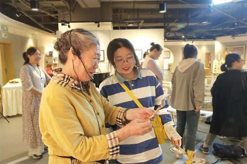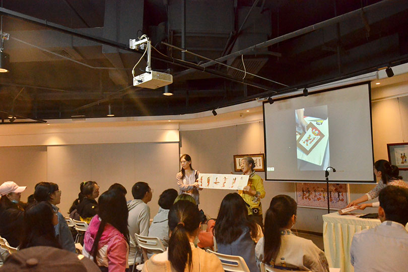 在讲座结束后,贺老师带领同学们参观所展出的折纸作品,并介绍如何构思创意、如何利用材料特性进行创作等,针对学生们提出的问题,贺老师耐心地进行了解答,使得学生们在近距离观看彩纸折叠作品的同时,也更为深入地了解和感受到了这项技艺的独特魅力。
