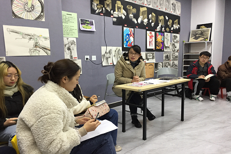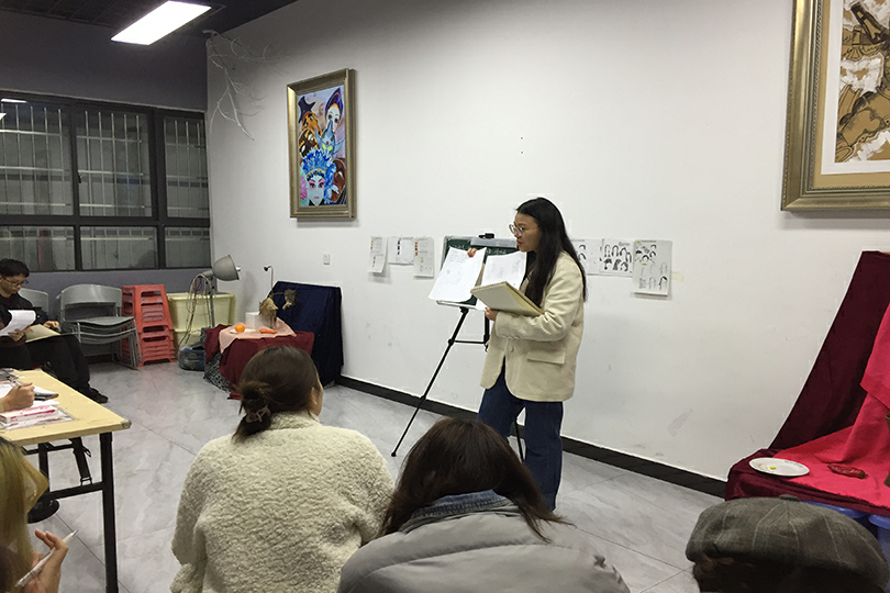 参赛同学在预先备课后分成五组,分别进入五个教室进行。模拟面试说课从语言、教态、内容设计、重难点把握、教法学法、板书等方面对选手进行综合考核。画院的评委老师们逐一对同学们的优缺点进行了点评,针对出现的板书不规范、语速不恰当、重难点不突出等问题进行了专业的指导。同学们通过参加本次活动获得了在课堂上学不到的知识,进一步了解到自己的不足之处和需要努力的方向,受益匪浅。