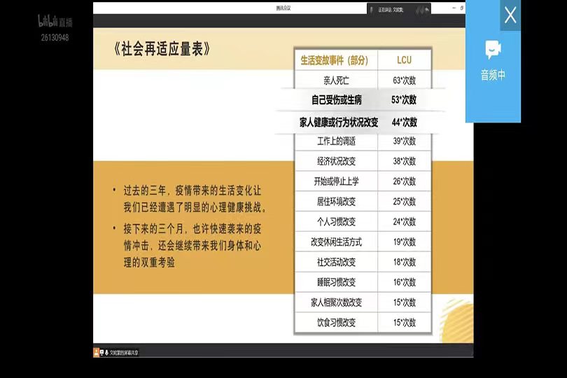 当前,新冠疫情进入新的发展阶段,部分学生的身心受到冲击。12月21日下午,我校与湖南大学、湖南警官学院联合开展了“疫情新阶段,做好‘心’准备”线上主题讲座,来帮助同学们在居家隔离和线上学习中保持更好的心态,积极应对疫情防控新变化。本次讲座由湖南大学心理健康教育中心专职教师文姹紫担任主讲。