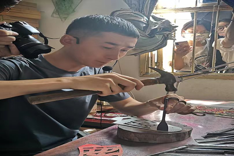 吴渊首先向同学们介绍了中国皮影戏的发展历程及地域流派,细心讲解了湘潭纸影的艺术特色。他亲自展示了湘潭纸影的制作工艺:麻纸材质雕镞经历制浆、制壳、下料、绘图、单雕、合成等10道工序完成;运用“异形刀法”影偶制作工艺,用剪纸镂空技艺,将影偶簇锉而成。随后,吴渊带领同学们参观博物馆,通过趣意盎然的情节铺展讲活了《姜太公垂钓》、《三娘教子》、《天水关收姜维》等纸影非遗作品。