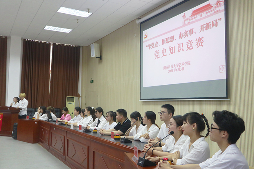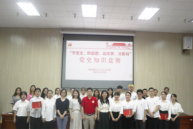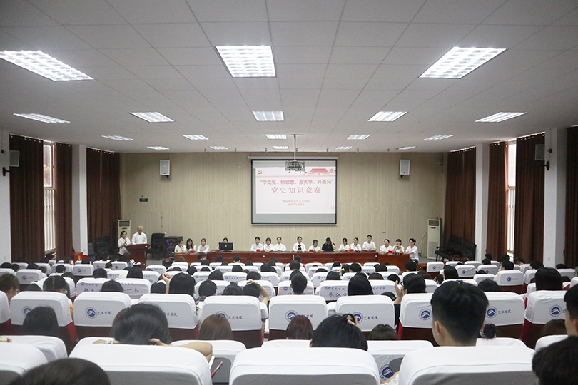 2021年6月3日,艺术学院于美术楼104举办了“学党史 悟思想 办实事 开新局”党史知识竞赛,五支参赛队伍由五个学生党支部各派3名选手组成,学院党委副书记胡鹏、组织员谭君、辅导员郑婷婷、龙睿及现场近300名学生出席。