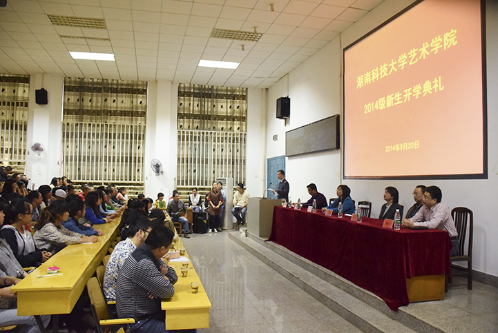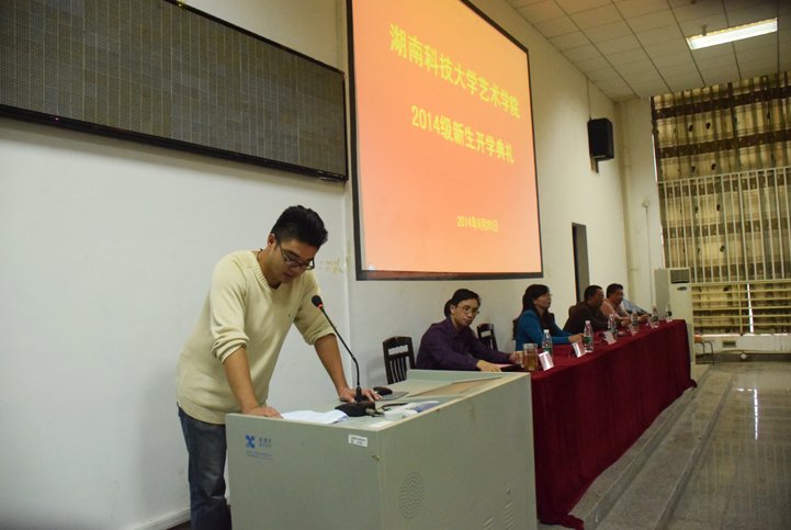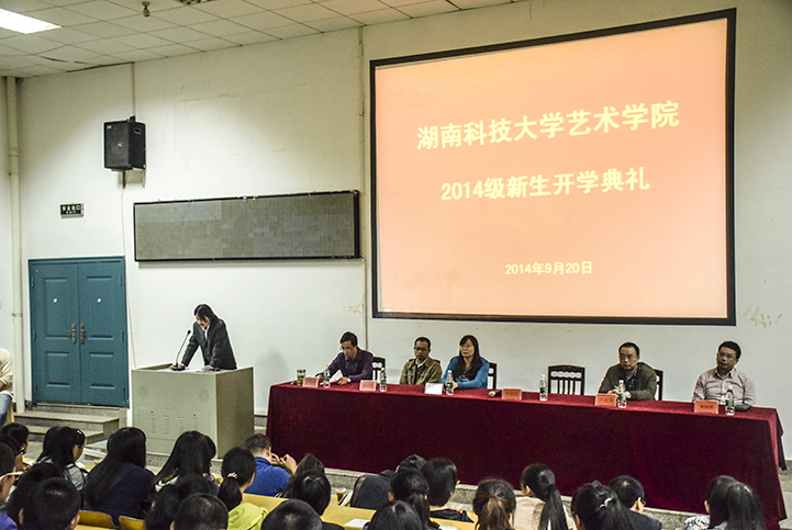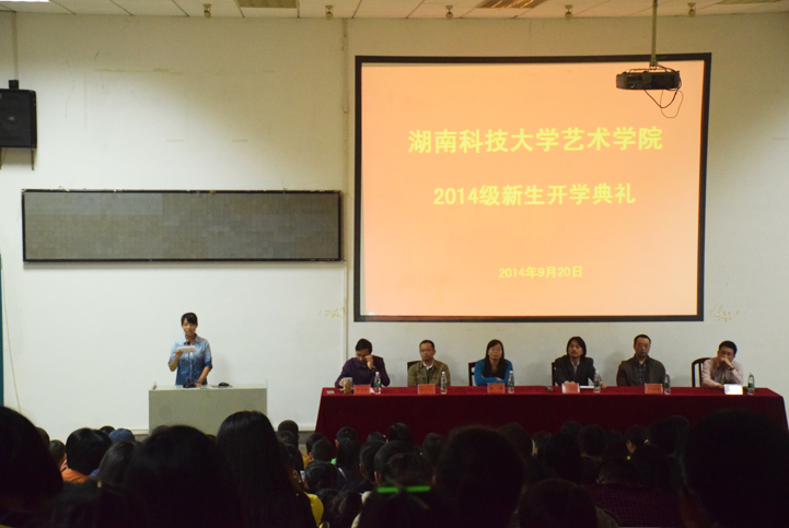 9月20号上午,我院在美术楼104举行2014级新生开学典礼。院党委书记张琳、副院长李毅松、邹正洪、尹建国、熊晓辉出席典礼,学院各部门领导、2014级班主任和辅导员以及全体新生参加典礼。典礼由院党委副书记罗登辉主持。