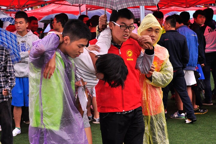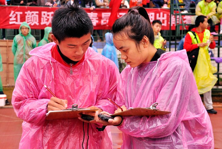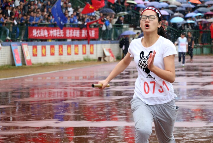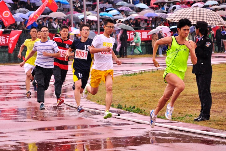 赛场上,不仅是运动员,穿着雨衣拿着单反在操场上奔跑的校园记者、一直在淋雨但依旧站得笔直的护卫队、维护场内秩序的组织部的人员还有其他后勤管理者也是赛场上一道靓丽的风景线。赛场上紧张激烈却又友好互助的良好气氛感染了在场每一个人。