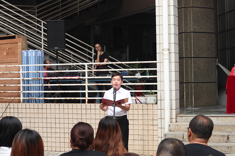 在激昂雄壮的国歌声中,典礼正式开始。李毅松首先致辞,他代表学院向全体师生致以秋日里最美好的祝愿。在讲话中,他简要向大家介绍了学院特色以及学院开设的各个专业,他表示大学是人生中一个重要的十字路口,所有同学应加强思想观念与学习方法的转变,开阔视野,培训创新性思维,注重理论与实践相结合,珍惜光阴,夯实基础,从内心深处感受大学。接着,教师代表周丰庆发言,他首先向所有新生表示了美好的祝愿,他强调希望大家拥有健康的体魄,健康的心灵,努力学习专业知识,在大学里快乐成长。此外,在校学生代表、院学生会主席陈帅帅发言,他希望19级新生在大学生活里努力提升自己的交际能力、组织管理能力。研究生代表刘哂吸发言,她深情回顾了自己的本科生涯,并指出,在学习中我们要努力制定计划、明确目标、把握重点。最后,本科生代表何钰莹发言,她激励同学:用汗水滋润青春,用梦想点缀人生!