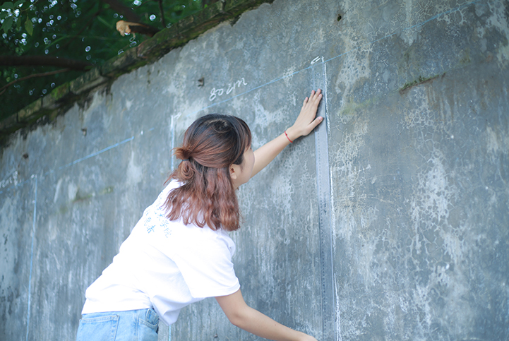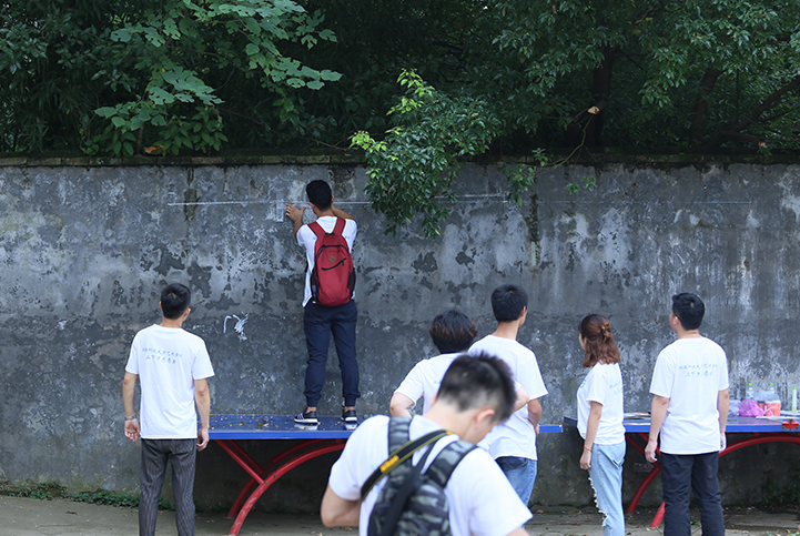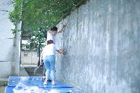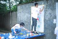 在绘制过程中,成员们分工明确。因需要在高处作画,成员们分成几组,分别负责作画、调色、各种颜料的准备,描边工作等。尽管烈日当头,志愿者们依然保持认真的态度,一笔一划细心描绘,同时从老师也参与到同学们的绘画工作当中来,体验墙绘的乐趣。墙绘制作过程中,我们的志愿者们也成为校园里一条亮丽的风景线,吸引了许多当地居民驻足观看并得到大家的高度赞赏。