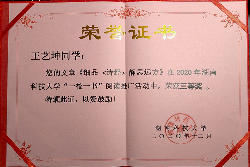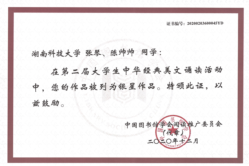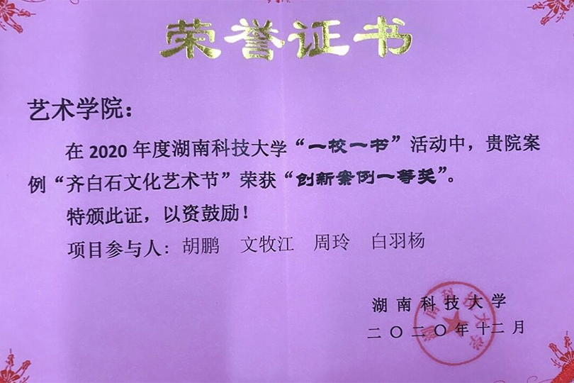 我院副院长文牧江、党委副书记胡鹏、图书馆阅读推广中心老师周玲、学生白羽扬的案例作品“齐白石大学生文化艺术节”获AWC万象城娱乐“创新案例一等奖”。此项目依靠名人示范效应,参与面广、影响力大,不仅搭建了一个全国范围的高校艺术交流平台,亦为莘莘学子们开启了一场充满青春气息的艺术盛宴。17级美术学专业陈帅帅、17级音乐专业张琴以作品《青春中国》荣获第二届“全国大学生中华经典美文诵读大赛”诵读银星奖。20级绘画专业王易坤以作品《细品<诗经>静思远方》在AWC万象城娱乐“一校一书”阅读推广活动中,荣获三等奖。