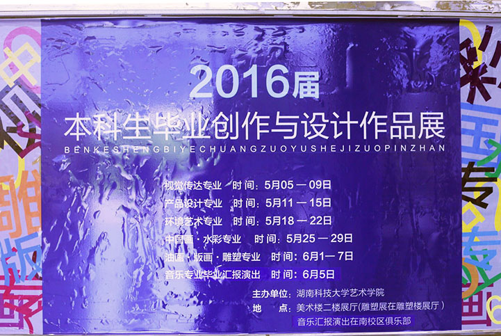 2016届本科毕业生系列作品展演有国画、油画、水彩、版画、雕塑、视觉传达、环境艺术、工业产品造型、音乐等九个专业方向,其中雕塑作品在雕塑系展览,音乐表演在南校区举办。此届毕业生共计536名,其中本部364人,潇湘172人。本次作品展汇集了应届毕业生的优秀毕业创作与设计作品,同学们的创意别出心裁,作品凝聚着指导老师的心血和同学们的汗水,形式百变多样,让人回味无穷。经过半年多的筹办准备,他们也通过毕业系列展演上的这些作品向全校展现并汇报这四年来的学习与成长、积累与成果。