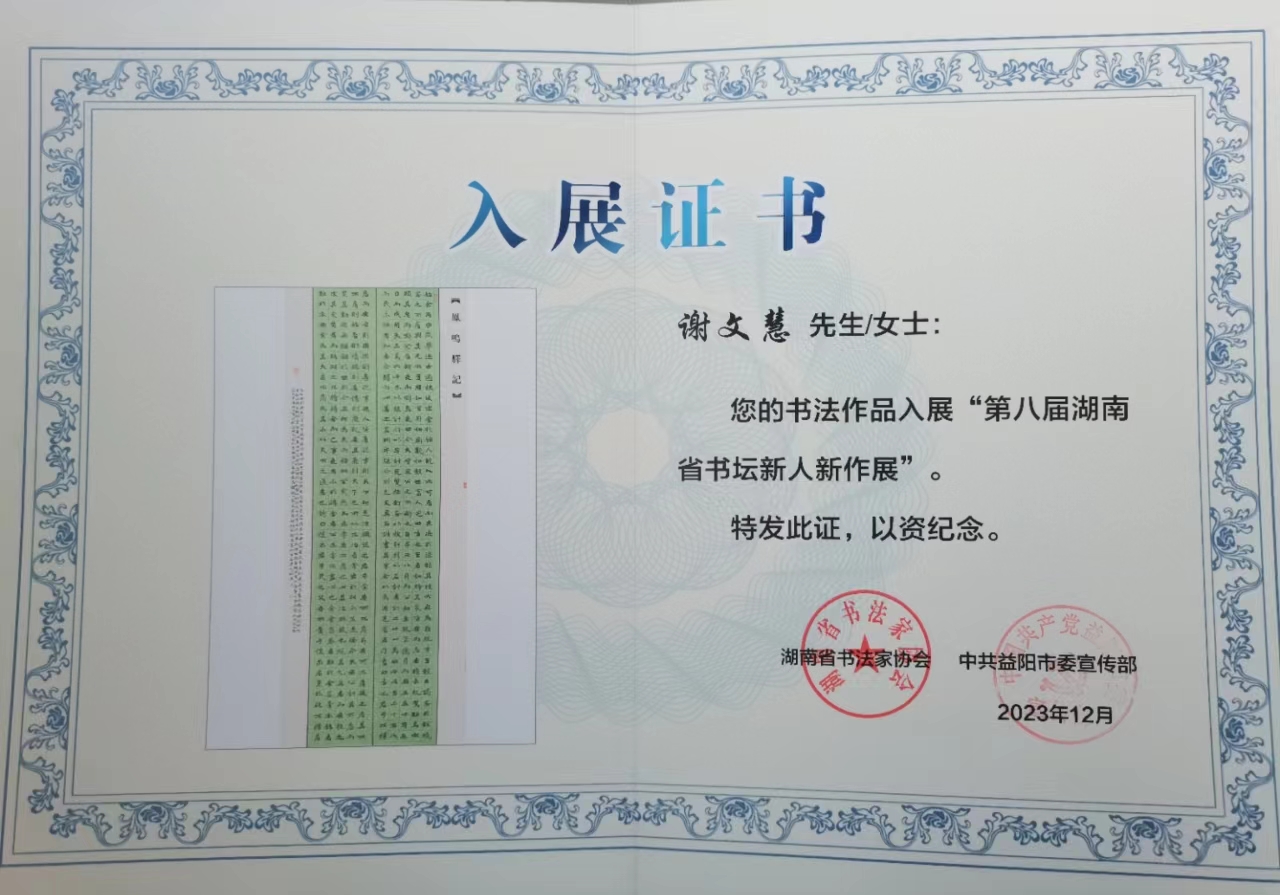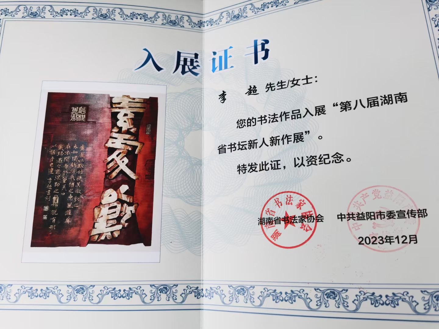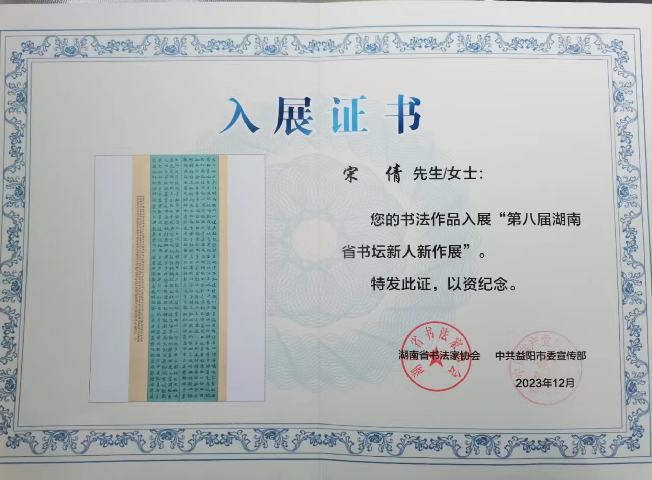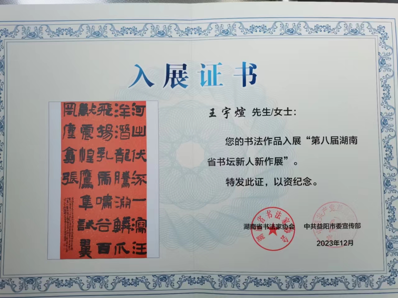 第八届湖南省书坛新人新作展12月29日在益阳市美术馆开幕。此展由湖南省书法协会与益阳市市委宣传部共同主办,自7月开始征稿以来,基层作者参加人数超过7000人次,经过初评、复评、终评和文字审读等多重严格考验,最终遴选219人入展,106件作品入选。其中来自AWC万象城娱乐朱竞生老师指导的李超、谢文慧、王宇煊和宋倩四位同学顺利入展!