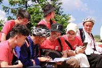 实践团队首先请到了85岁高龄的瑶家老人和国家级非物质文化遗产保护项目代表性传承人奉雪花演示了花瑶挑花技艺,并对花瑶挑花的制作工艺、装饰图案、色彩搭配、题材表现等进行了调研,拍摄了相关图片资料。随即驱车前往风景俊美的草原梯田考察原生态的呜哇山歌,三位呜哇山歌国家级非物质文化遗产保护项目代表性传承人表演了精彩的唱段,队员们都被高亢婉转的歌声所折服。他们积极与传承人进行交流,了解呜哇山歌的曲调节奏、表演形式,认真考察呜哇山歌的发声技巧,记录呜哇山歌词曲调式。随后,音乐组成员虚心向传承人求教,跟着热情的传承人学唱呜哇山歌,认真体会呜哇山歌的表演技巧,收益良多。