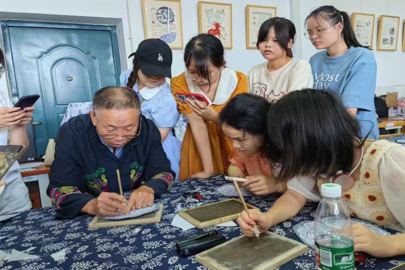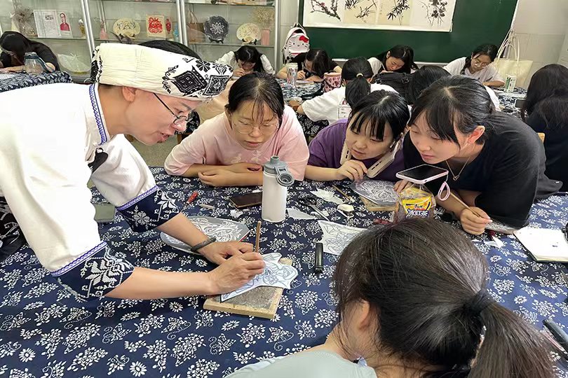 在实践环节中,传承人杨桂军向同学们介绍了踏虎凿花的自制蜡板、纸钉、剪刀、锥针、刻刀、粉袋、订书机等制作工具的使用方法,并讲解将拷贝纸折成三角形进而变纸钉的用法、凿刻的规律以及阴阳刻法等,最后强调了踏虎凿花的精髓与自制蜡板的小奥秘。凿刻练习中,三位传承人手把手教大家,热心示范、悉心指导、耐心答疑。第二天,同学们在深入了解踏虎凿花的基本技艺后又进行了主题性的艺术创作,硕果累累。