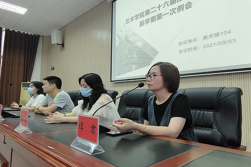 为加强学生会各部门间的联系,促进新学期工作的顺利开展,9月3日下午,艺术学院于美术楼104报告厅召开了第二十六届团委学生会新学期第一次例会。院党委副书记胡鹏、组织员谭君、学工办辅导员张晶晶、龙睿出席本次会议,第二十六届团委学生会全体干部参与。例会期间,我院学生会成员均佩戴口罩,并保持安全距离。