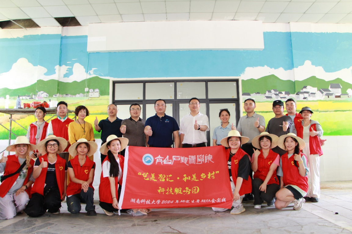 在常德,学院“艺美智汇·和美乡村”科技服务团在鼎城区谢家铺镇留下了浓墨重彩的一笔。团队成员们结合艺术学科优势,紧扣乡村实际,策划并实施了“乡村印记”系列实践活动。开展了“大手拉小手,共绘家乡美”支教活动,进行了别开生面暑期防溺水安全教育,通过“拍手印树”艺术表达承诺的方式,提高留守儿童的安全意识;开展了“且以深情共白头”金婚夫妻和“且做人间长寿仙”高寿老人花式创意公益摄影;“门前三小”文化秀,在小书屋进行阅读打卡,在小讲堂进行非遗文化宣讲,在小广场上开展非遗游园会,村民们在漆扇、皮影戏、手绘糖画、石膏绘梦体验区,亲手感受非遗传统工艺的精妙与匠心独运;在常德鼎城乡村振兴学校多功能厅,三大幅墙绘作品以站在稻田视角描绘村民在广袤天地中春耕秋收辛勤劳作的场景,以此宣传当地水稻种植特色文化,展现出谢家铺万亩良田的壮丽景象。每一项活动都紧贴民生,助力当地法治、幸福、和谐街道的建设,为和美乡村的打造贡献了青春力量。