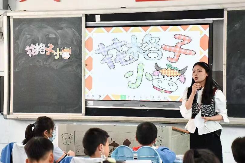 检查小组首先在2109班听了一堂实习老师唐碧晴的汇报课—《花格子小牛》,唐碧晴首先通过一个微信订单———给农场主家的小牛参加晚会设计漂亮衣服导入课程内容,整堂课课堂气氛活跃,学生们踊跃发言,循循引导孩子们发挥自己的想象力,自己动手制作出了独一无二的花格子小牛并上台展示了制作成果。本节课很好地达成同学们对花格子小牛的制作及运用色彩进行装饰的课程目标。
