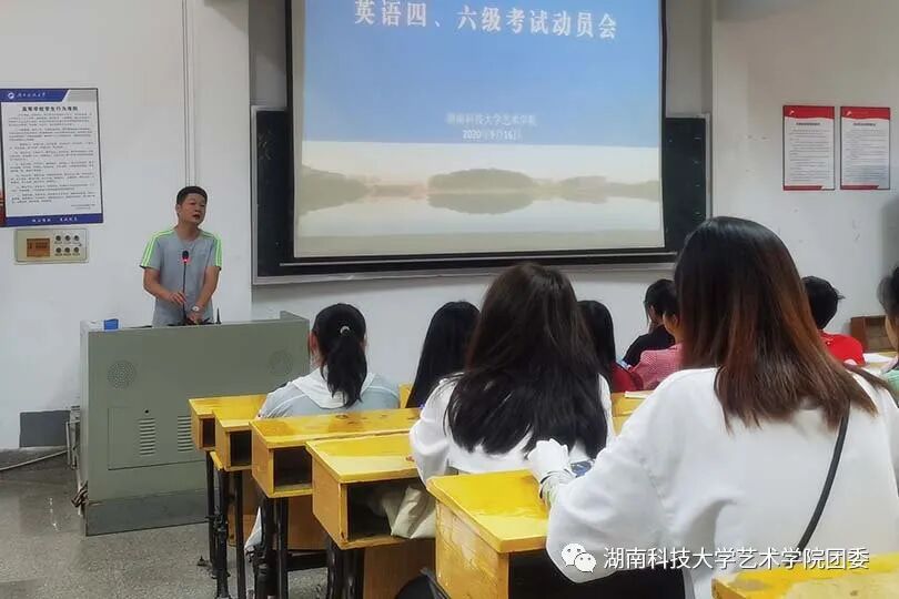 为响应学校号召,督促学生积极参考、诚信应考,9月16日下午1:20,我院于美术楼119教室召开了英语四、六级考试动员大会。会议由胡鹏书记主持召开,艺术学院全体报名参加四、六级考试的同学参加了此次会议。