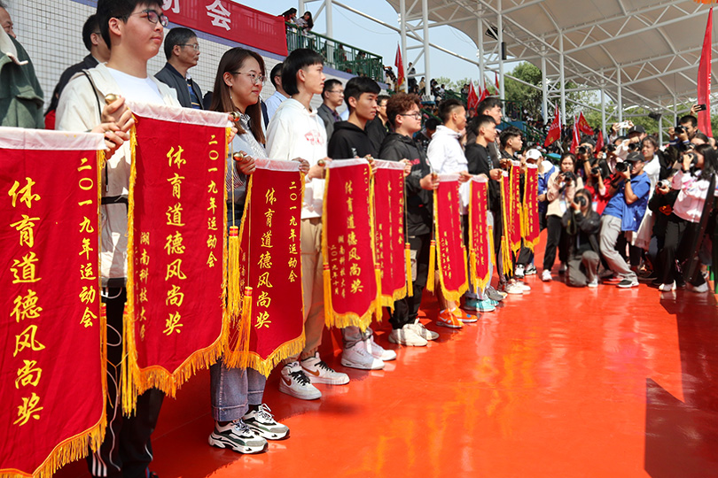 在一阵阵擂鼓呐喊,一遍遍鼓掌摇旗中,胡石其首先代表学校向取得优异成绩的班级和运动员们表示了热烈的祝贺,并向为本届运动会取得圆满成功而付出辛勤工作的裁判员、工作人员表示衷心的感谢,他指出同学们在此次体育竞赛中充分体现了团队协作、超越自我的体育精神,运动员们积极向上的风貌展现了乐观、进取、拼搏的科大风采,并希望同学们能将赛场上顽强拼搏的精神带到日后的学习和工作中去,为学校建设做出更多的贡献。随后由相关领导嘉宾为获奖学院与优秀运动健儿们颁发荣誉奖杯与锦旗,我院在本次秋季运动会中荣获道德风尚奖。