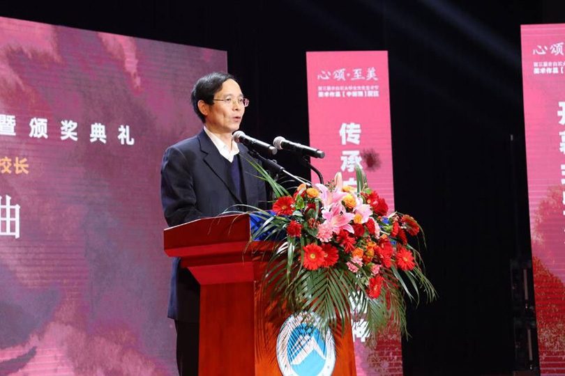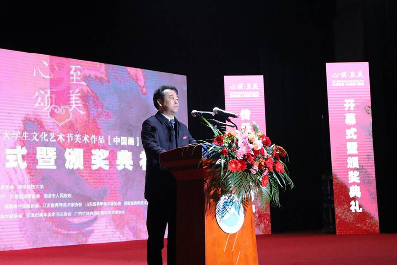 校长朱川曲致开幕词,他代表我校向艺术节的开幕表示诚挚的祝贺,向莅临开幕式暨颁奖典礼的各位领导、来宾表示热烈欢迎,向各位获奖者表示由衷祝贺。湖南省教育厅党组成员、工委委员、省委教育工作领导小组秘书组副组长刘静提到艺术节的开展积极响应了发展中国特色社会主义优秀文化的号召,鼓励有能力的艺术青年积极参加。湖南省文联副主席、湖南省美协主席朱训德也高度赞扬了艺术展的举行,表示希望青年立足于中国美学精神。中国美术家协会理事、荣宝斋副总经理、荣宝斋画院院长唐辉对艺术节的开展及丰硕成果表示赞颂。
